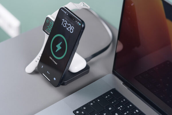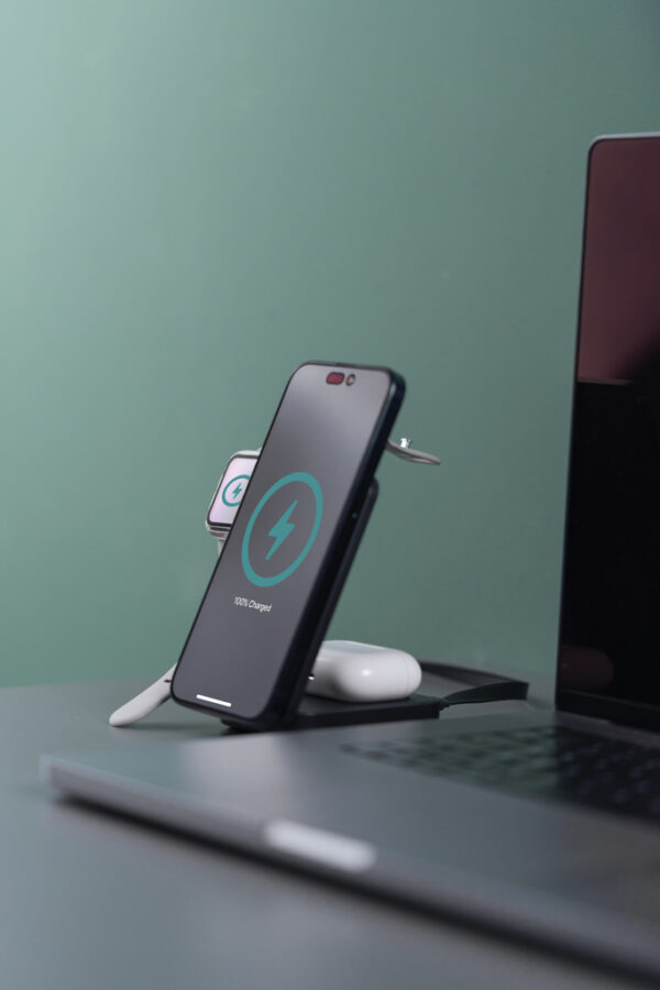 Recharge magnétique ultra-rapide de 15 W pour votre téléphone, avec des socles pour un deuxième téléphone/des écouteurs et une Apple Watch.